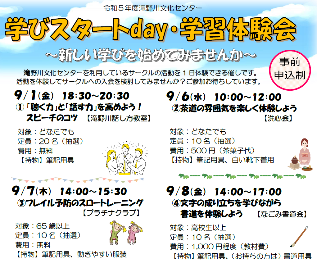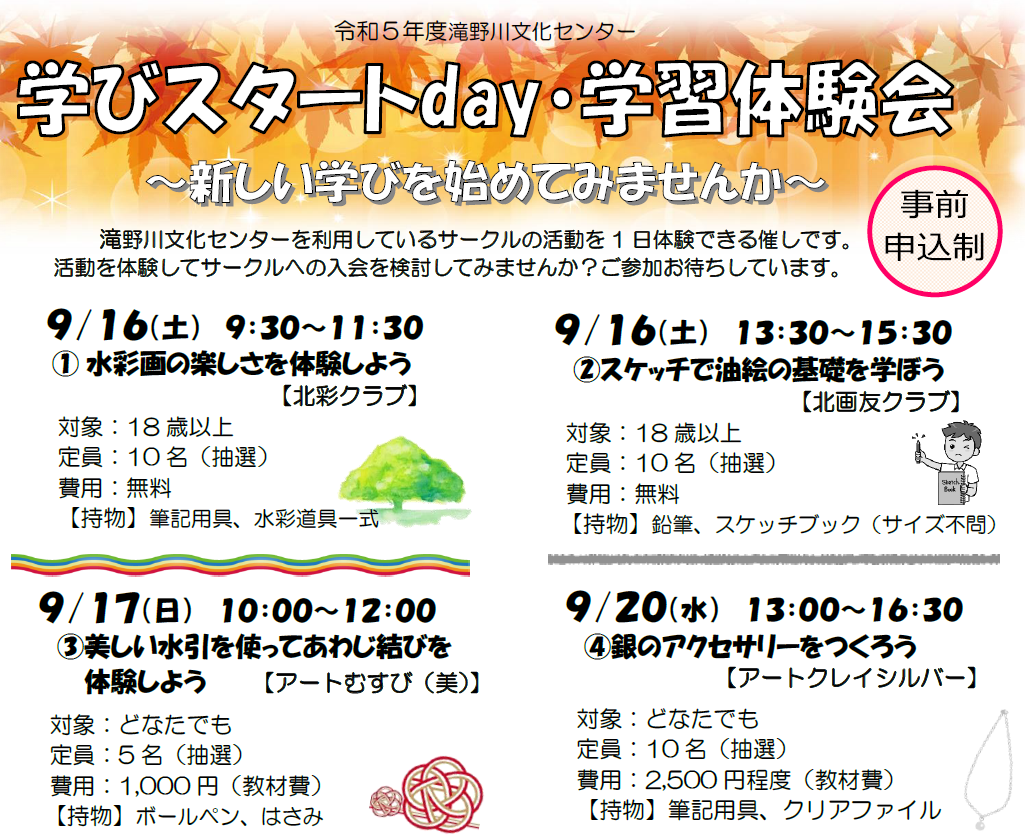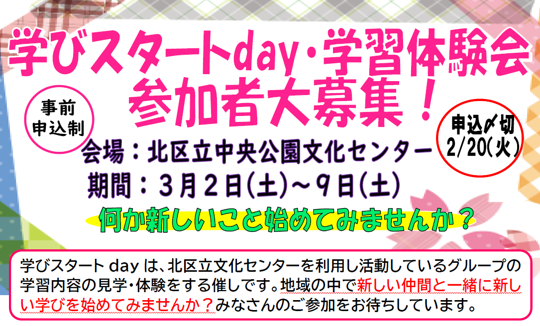 中央公園文化センターに集い、学ぶ、学習サークルの1日体験会です。 |