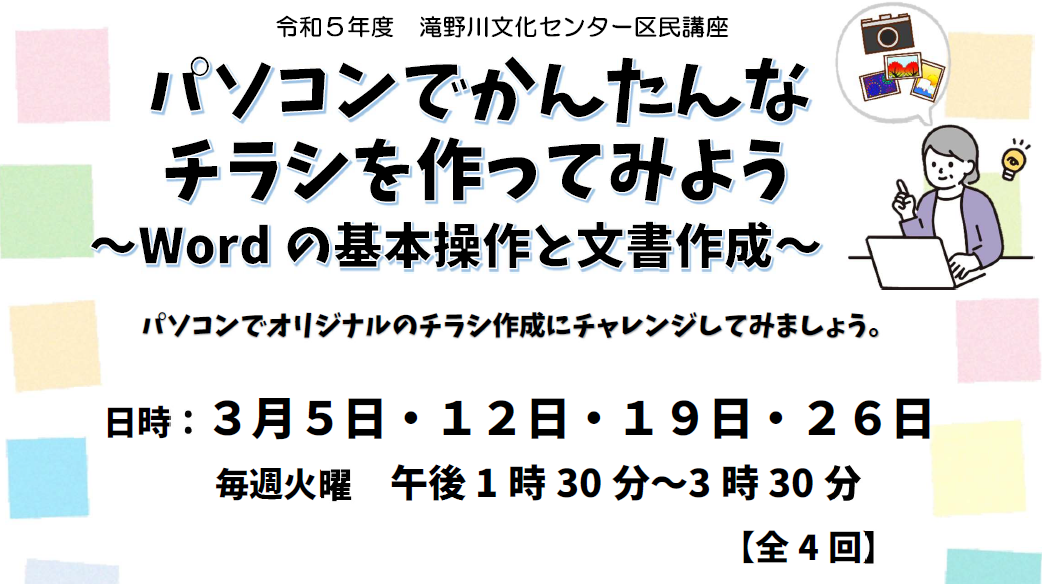区民講座 パソコンでかんたんなチラシを作ってみよう~Wordの基本操作と文書作成~ |