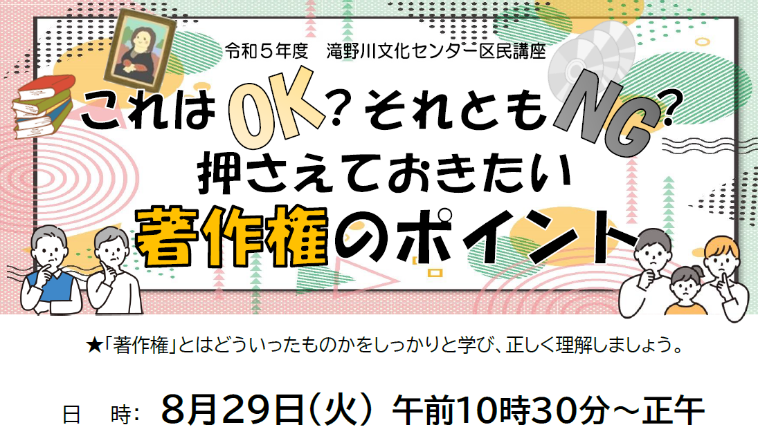 | [対象] 区内在住、在勤、在学の 方でパソコンの文字入力が できる方 [日時] 2/7~2/21 毎週水曜 計3回 13:30~15:30 [講師] 神澤裕子氏 [定員] 12名(抽選) [費用] 無料 [申込] 往復はがき(記入例参照)で、 1/22(月)必着 ー問合わせ・申込先ー |