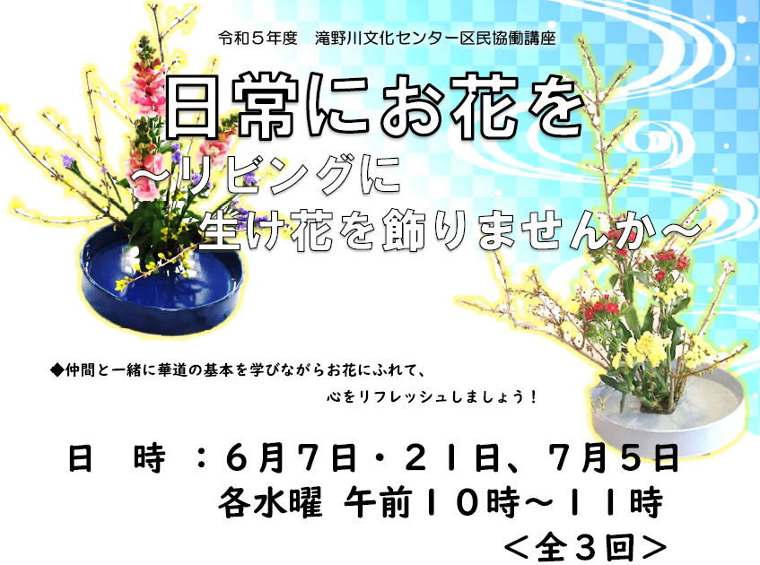 [対象] 区内在住、在学の小学生と 保護者(1組3名まで) [日時] 5/7(日) 10:00~12:00 [講師] フラワーサークルボヌール 代表 林一恵氏 [定員] 10組(抽選) [費用] 1,800円(教材費2本分) [申込] HP、電話、窓口で、 4/27(木)必着 ー問合わせ・申込先ー |