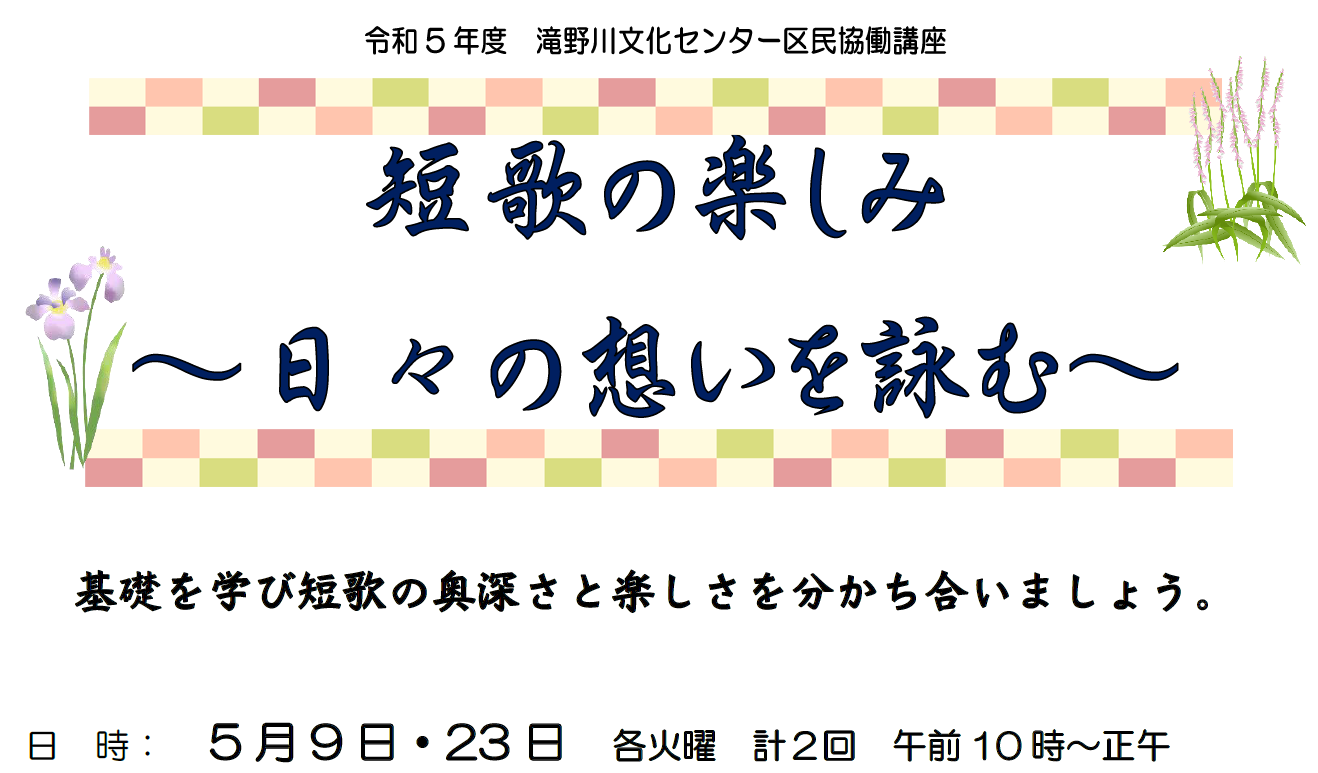 [対象] 区内在住、在勤、在学の方 [日時] 5/9・23 各火曜 計2回 10:00~12:00 [講師] 篠埜清風氏 [協力] 短歌会清風 [定員] 15名(抽選) [費用] 無料 [申込] はがき、ファクス(記入例 参照)、 電話・窓口で、 4/19(水)必着 ー問合わせ・申込先ー |