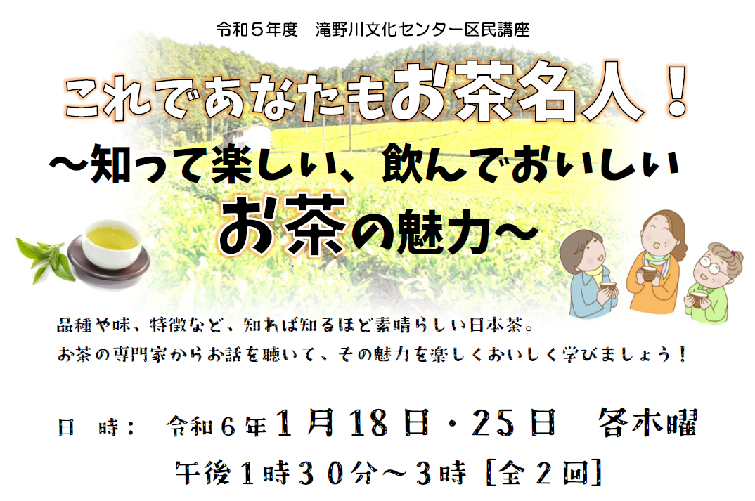 [対象] 区内在住、在勤、在学の方 [日時] 2/2・16、3/1・15 各金曜 計4回 18:30~20:00 [講師] 茶道師範 篠埜敬子氏 [協力] 茶道裏千家清風会 [定員] 10名(抽選) [費用] 2,000円(教材費・全回分) [申込] はがき・FAX(記入例参照)、 電話、窓口で、 1/23(火)必着 ー問合わせ・申込先ー |